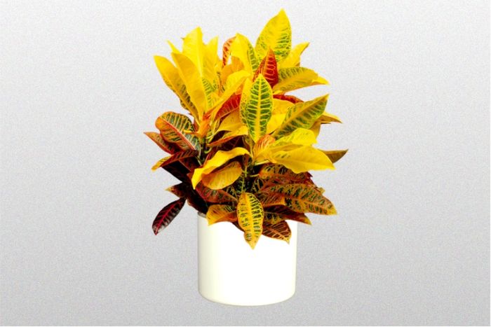 A croton has beautiful leathery leaves that come in various shades of yellow, red, orange and green. It is a high light plant that should be kept a little moist but never soggy. Crotons are susceptible to spider mites. Keeping your plant clean with a mild soapy solution will keep most pests away. A croton makes a lovely floor or table plant.